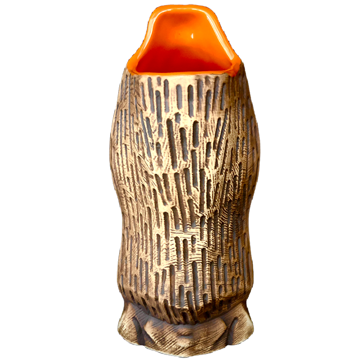 This ceramic tiki mug depicts bust of a mystical shaman with wide eyes, flared nostrils, and a mean underbite.