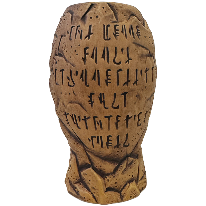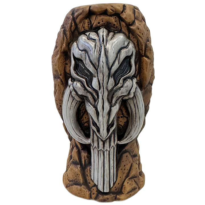 This ceramic cocktail mug depicts the skull of a Mythosaur and it was released by Oga’s Cantina in Star Wars: Galaxy’s Edge. In the Star Wars universe, mythosaurs are ancient and formidable sea creatures native to the planet Mandalore. These beasts are central to Mandalorian lore due to their massive size, incredible power, and the legendary tale of Mandalore the Great, who was said to have tamed one. This act led to the adoption of the mythosaur skull as a lasting Mandalorian emblem. Though long believed to be extinct, the mythosaur’s appearance in The Mandalorian series on Disney+ suggests a possible rebirth for Mandalorian culture and identity. This mug was manufactured by Tiki Farm.