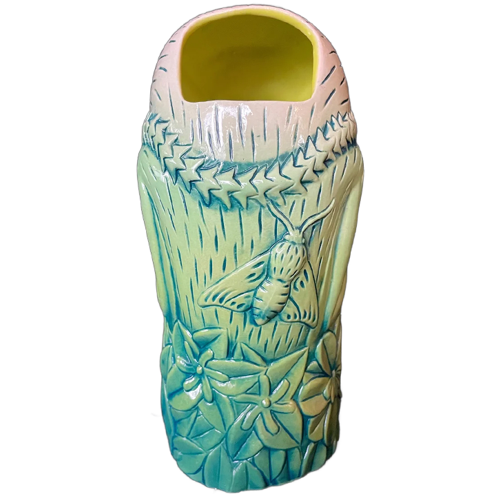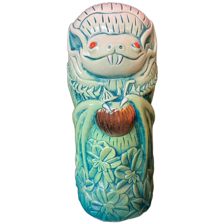 This ceramic cocktail mug was designed and produced in the United States by Lowtiki. It Depicts an Ōpe’ape’a, which is the only native land mammal of the Hawaiian islands. Adorable and important, these animals are excellent pollinators and help control the insect population. This mug features a green and white ombre glaze with a golden coconut and red eyes. It was sold in other glazes as well.