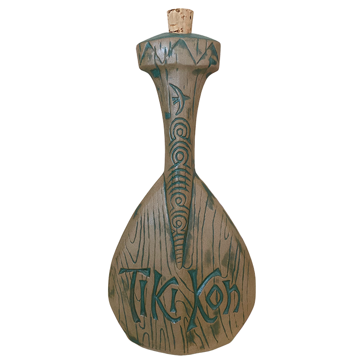 This ceramic tiki mug depicts a paddle decanter with a tiki face and cork top.