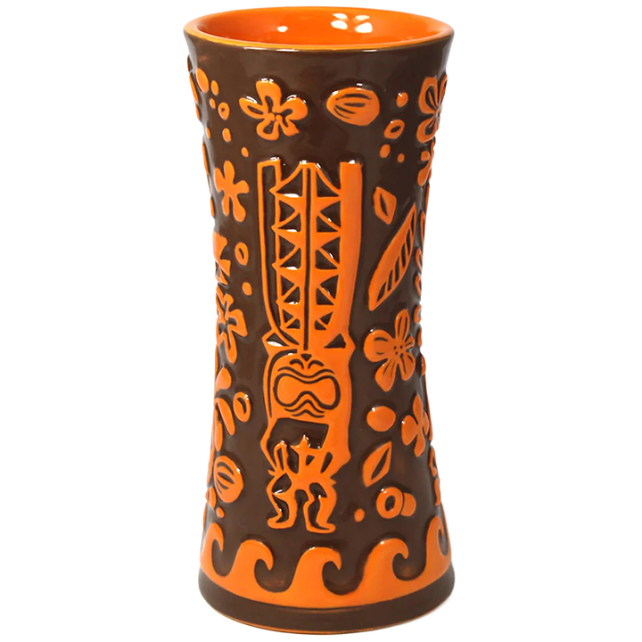 Inspired by rich, orange-hued sunsets, exotic tropical locales and the flora and fauna that greets you is the “Paradise Beckons” Tiki mug designed for Tiki Farm by renowned Japanese Tiki artist, Mookie Sato.