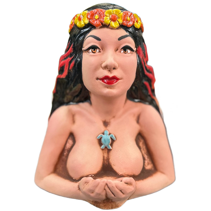 This ceramic cocktail mug is designed and sculpted by John Mulder. It depicts Pele, the goddess of volcanoes, fire, and lightning. It is manufactured in the United States by Eeekum Bookum. This 2nd Edition mug has the word “Pele” written on the back of it, as opposed to The Honu’s bar logo.