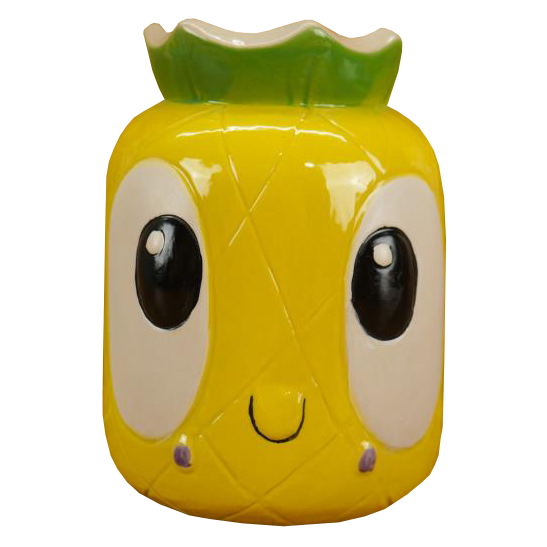 This ceramic tiki mug designed by Tiki tOny depicts a smiling pineapple with a cartoonish face.