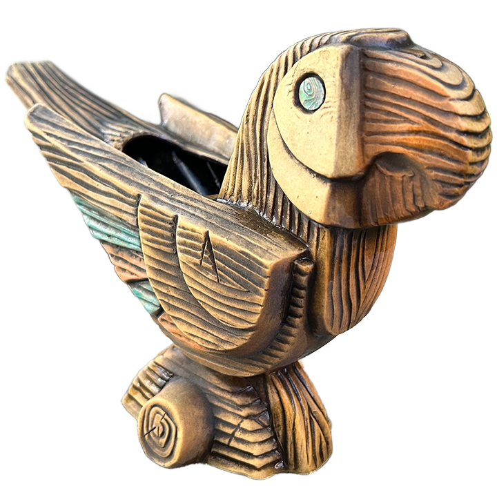 This ceramic cocktail mug is designed and sculpted by John Mulder. It depicts a parrot in a Witco-style with intricately hand sculpted wood grain and abalone inlay eyes. This mug is manufactured in the United States by Eeekum Bookum.