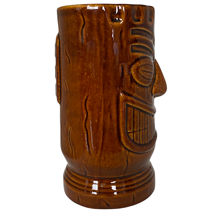 This tiki mug depicts an upright Tiki with a wide, cheeky grin, square teeth, and horizontal coffee-bean shaped eyes. It is inspired by a mug seen briefly in the animated film Incredibles 2 by Disney Pixar.