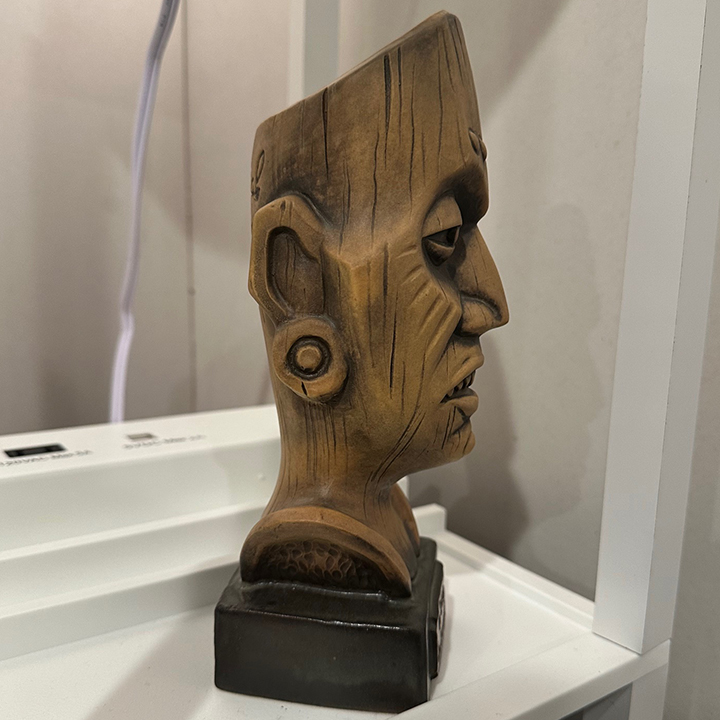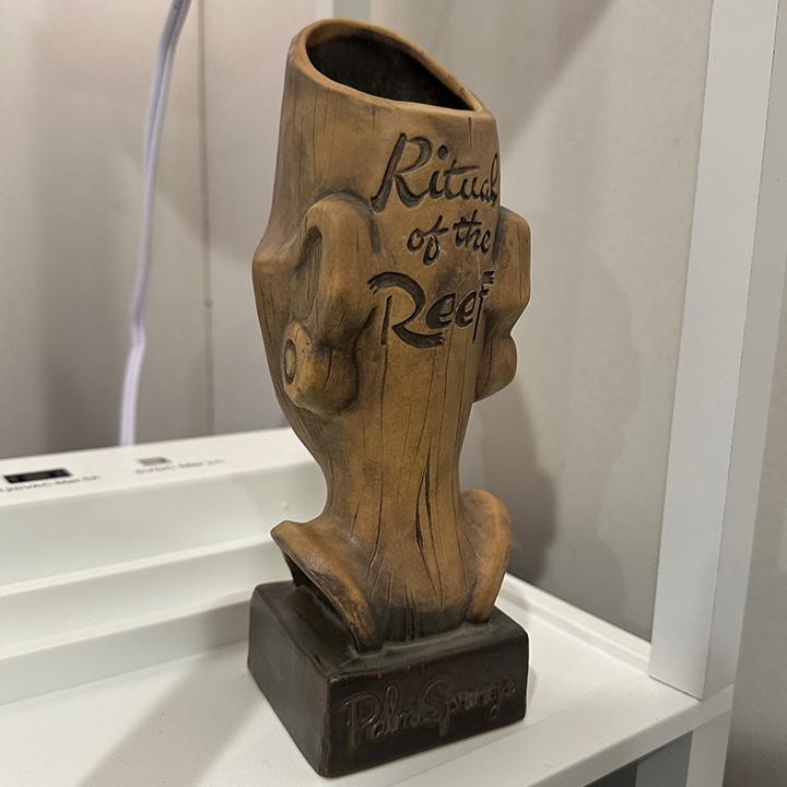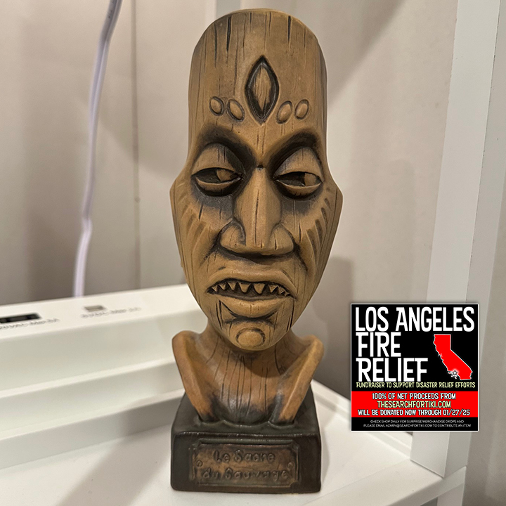 This ceramic cocktail mug was donated from a private collector to raise funds for charity. 100% of the net proceeds from this mug will be donated to support relief efforts in LA after the recent devastating wildfires. This mug depicts the head featured on the cover of Les Baxter’s “Ritual of the Savage”. It was designed by John Mulder and manufactured by Eekum Bookum for The Reef in Palm Springs.