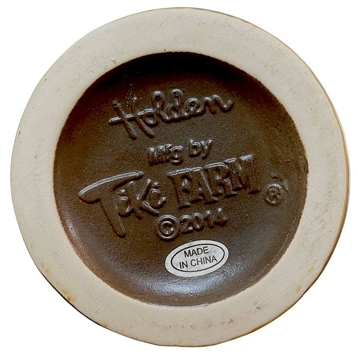 Unique Markings: “Three Dots and a Dash Chicago” is written on the front of this mug and “Holden Mfg by Tiki Farm ® 2014” is written on the bottom of this mug.