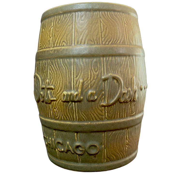 This brown ceramic tiki mug depicts a classic rum barrel with metal fittings.