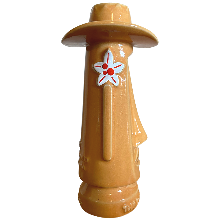 This ceramic cocktail mug was designed by Josh “SHAG” Agle for the Donn of Tiki movie Kickstarter. It depicts Donn as a moai, with a straw hat and his signature mustache. One ear has a flower and the base of the mug is marked “The Donn of Tiki” in capital letters. It was released in three different glazes and this particular edition was inspired by Marlene Dietrich’s favorite cocktail named “Beachcomber’s Gold”.