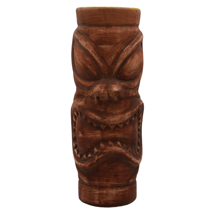 This brown tiki mug depicts a ku head with slanted eyes and a large open mouth lined with many sharp teeth.