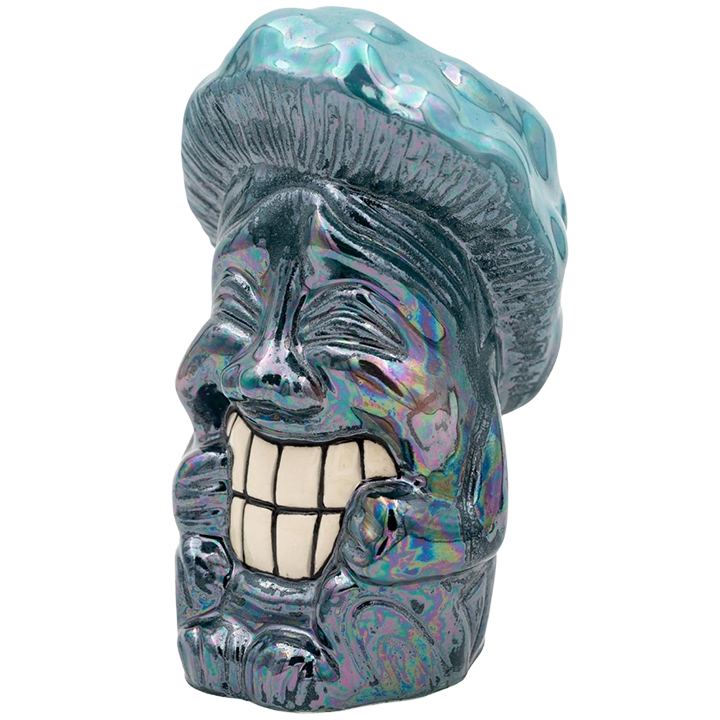 This ceramic cocktail mug depicts a whimsical mushroom with a wide, cheeky grin. It is manufactured by Niki’s Tiki and this version is the Midnight Edition which is limited to 5 mugs.