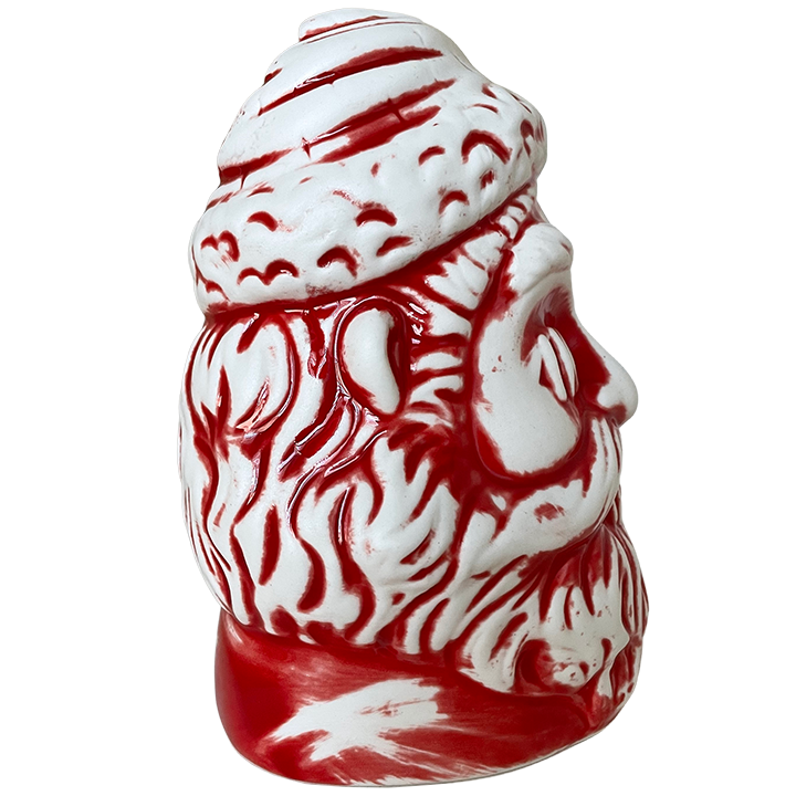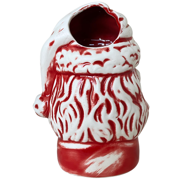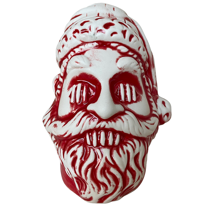 This ceramic mug depicts the shrunken head of Santa Claus. Santa is wearing his festive holiday hat, but his eyes and mouth have been stitched closed.