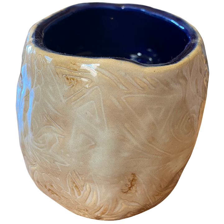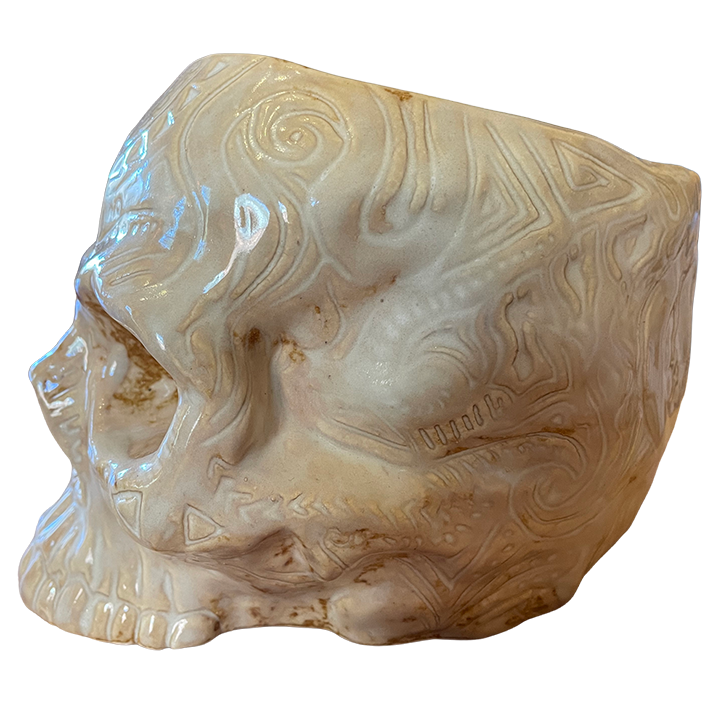 This ceramic cocktail mug depicts a shrunken skull covered in Ta Moko inspired carvings.