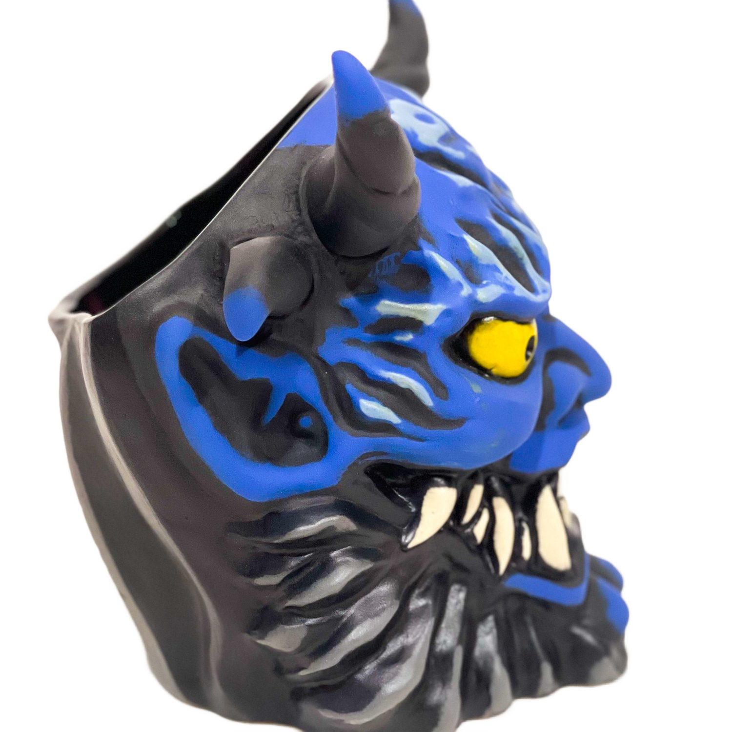 This ceramic cocktail mug is the third in a series of mugs created by Chris Shima of Shima Ceramics depicting Japanese demons. Shuten Doji, the drunken demon, was a bad-ass demon lord from 14th century Japanese mythology. The story is that as a human he was a mean, brutal drunk that put on a demon masking night as a joke, but that it stuck to his face permanently. He became a powerful, blood-drinking demon lord, one of the most feared yokai in Japan.