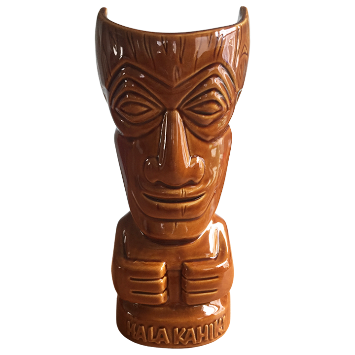This ceramic mug depicts the top half of a tiki with a closed mouth, broad nose, and its hands crossed in front with three fingers on each hand. This mug is based on a tiki that stood outside the Hala Kahiki for years.