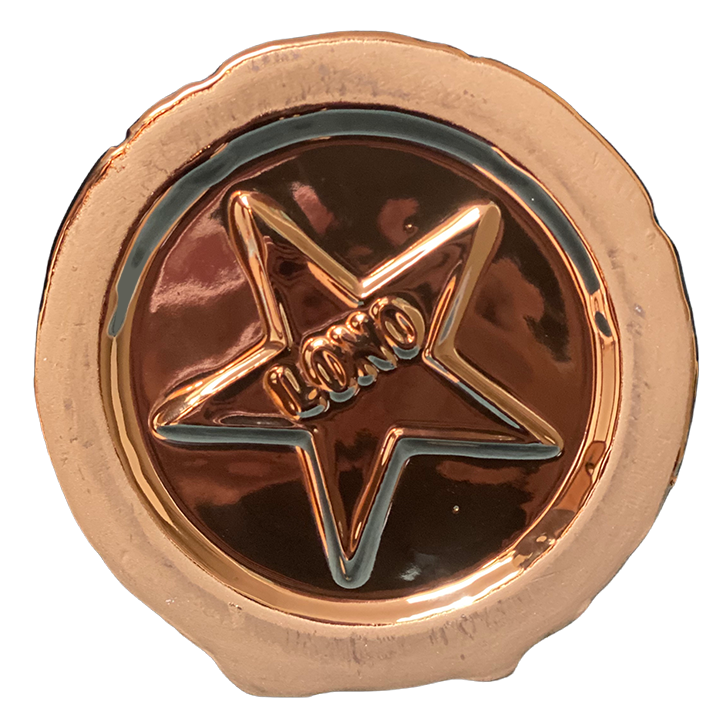 This ceramic tiki mug depicts the standing God Lono on the Hollywood walk of fame. This particular version was released for the second anniversary of LONO Hollywood and has a glossy gold glaze.