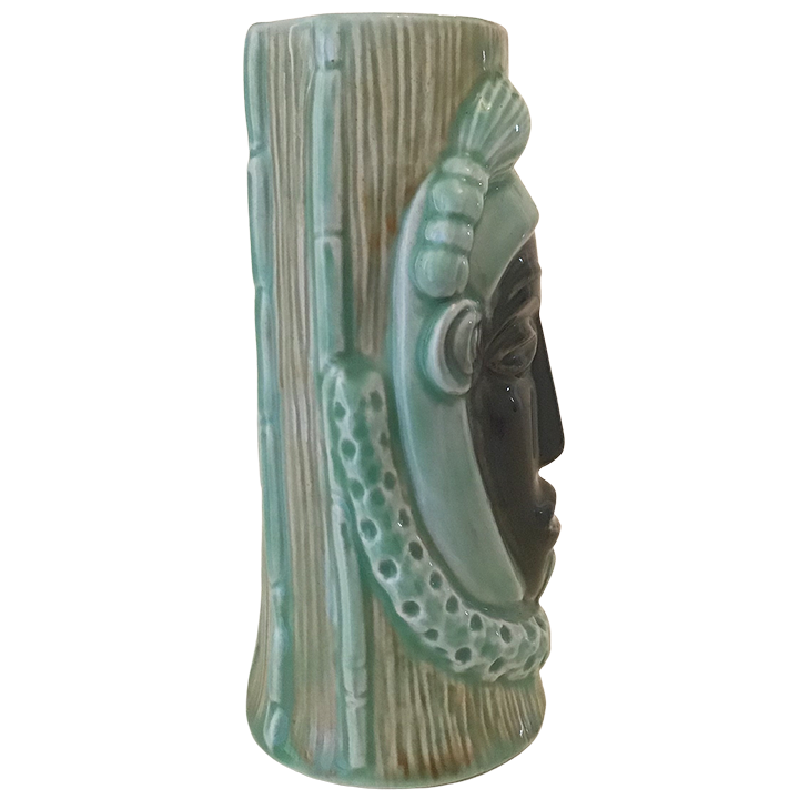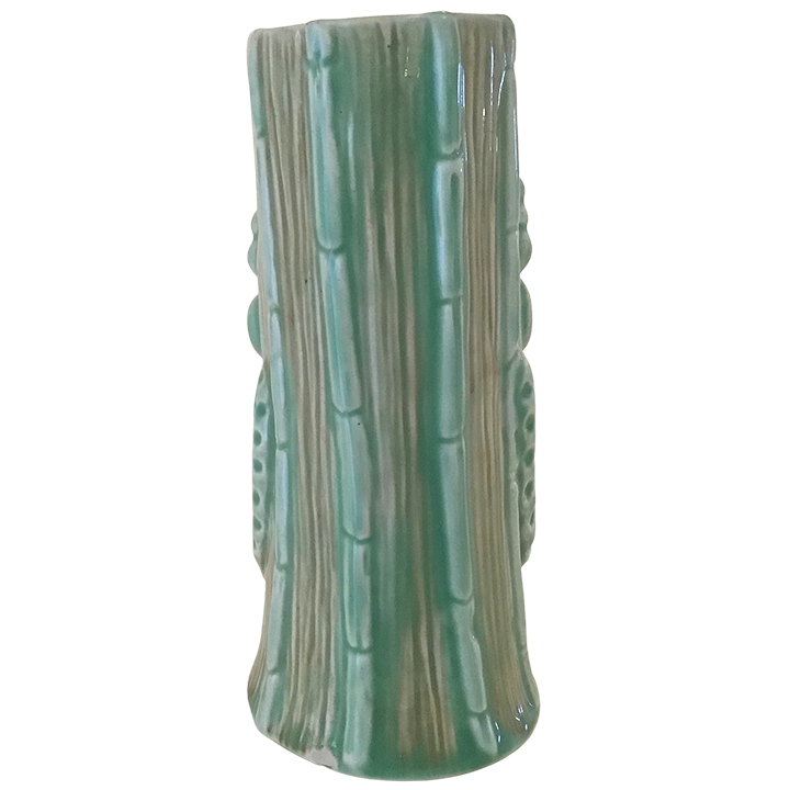 This green, ceramic tumbler depicts a stylized face with coffee bean shaped eyes and an angular nose.