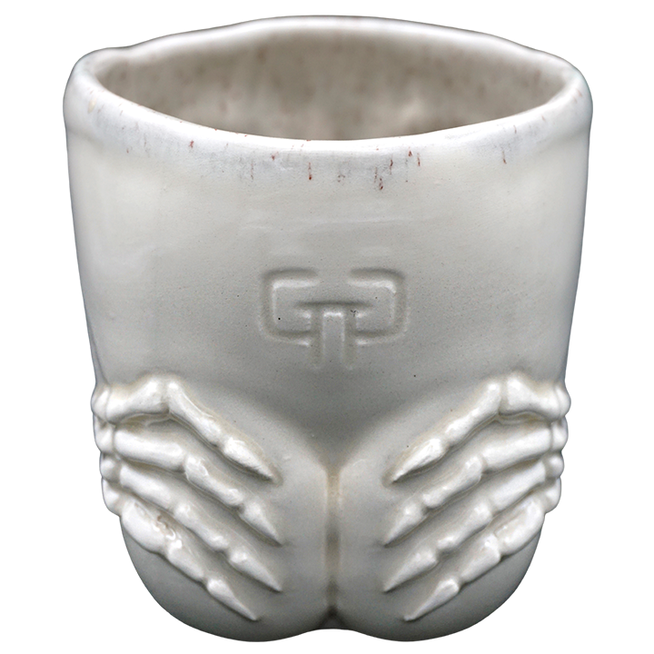 This ceramic cocktail mug depicts a human skull with breasts for eyes and a fleshy tongue that is sticking out. The jawbone of the skull transitions into skeleton arms that reach around the back of the mug to grab the skull’s butt.