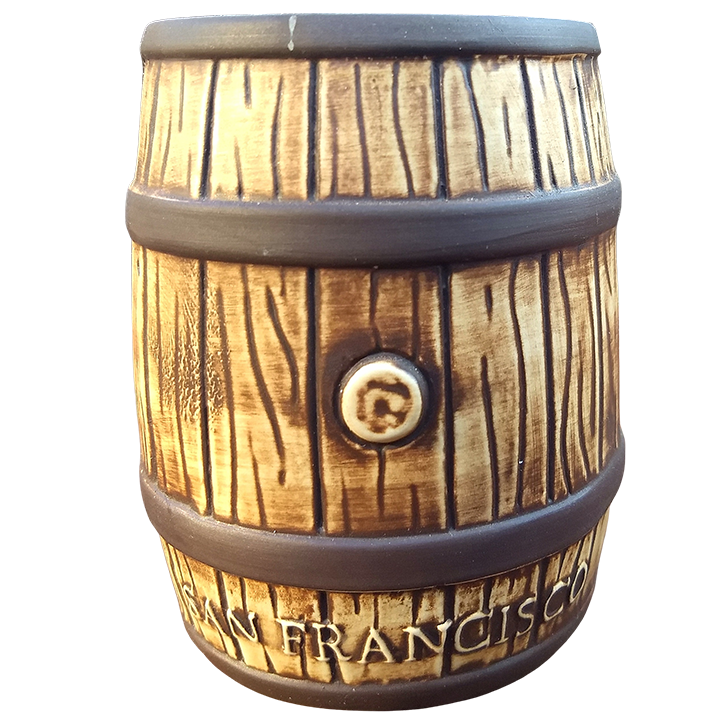 This ceramic cocktail mug is a realistic rum barrel in a light matte brown with a dark brown wipe to accentuate the details and dark brown rings.