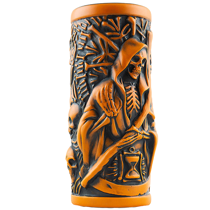 This tiki mug is part of Mondo’s Designer Series of mugs and features the Grim Reaper among many skulls and bones and was described by Mondo as “a cross between a Catholic candle and something from the Sediec Ossuary.” The reaper is holding a scythe and is featured with a hourglass that appears to have beams of light cascading from it.