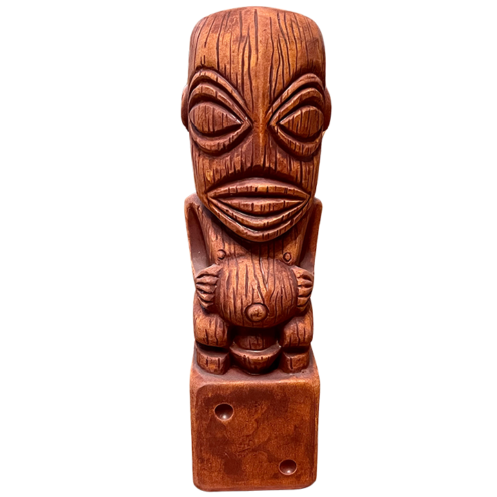 This ceramic cocktail mug was designed by Squid for the 2nd Anniversary of Frankie’s Tiki Room in Las Vegas. It depicts a Tangaroa style Tiki standing atop a 6-sided die with exaggerated genitalia and a pronounced belly.