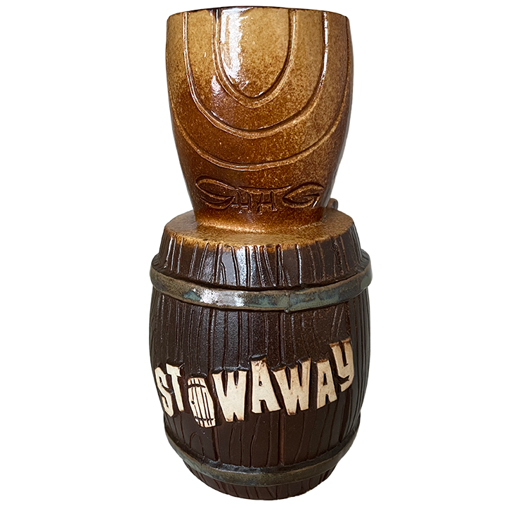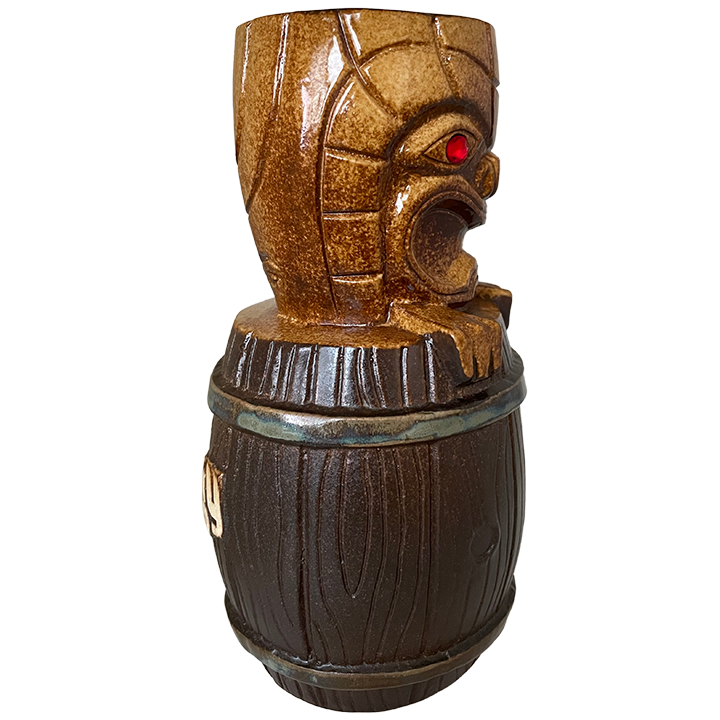 This ceramic mug depicts a traditional brown rum barrel with a stowaway Tiki inside. The Tiki has a wide mouth and red jewels for eyes. It is popping its head out of the barrel with its hands placed over the barrel’s top.