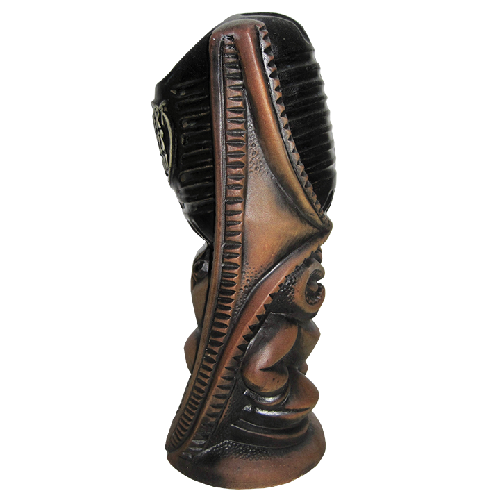 This brown ceramic mug depicts a standing Lono tiki with a headdress designed like a vintage microphone.