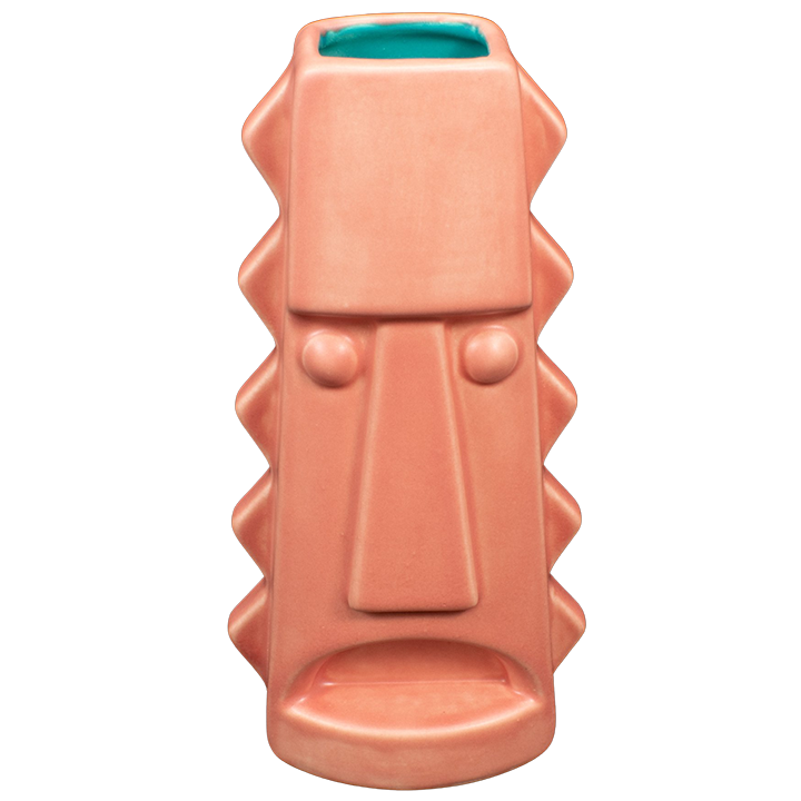 This ceramic tiki mug depicts a Moai head with round eyes, an open mouth and spikes on its sides.