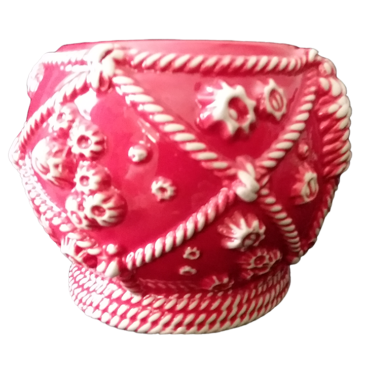 This ceramic tiki mug depicts a red ocean float covered in ropes and barnacles.