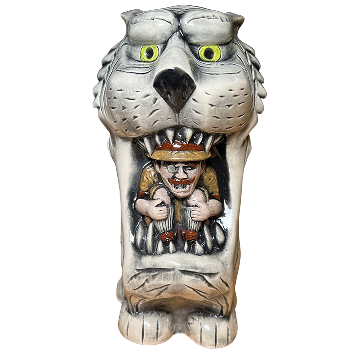 This ceramic cocktail mug is a fresh take by Lost Temple Traders on the classic “Missionary’s Downfall” cocktail motif. The missionary has been swallowed whole by a ferocious tiger. Depicted in a fetal position, the missionary is still visible behind the tiger’s menacing teeth. It was sculpted by Patrick Vassar and manufactured by Monkey Skull in at least three different glazes.