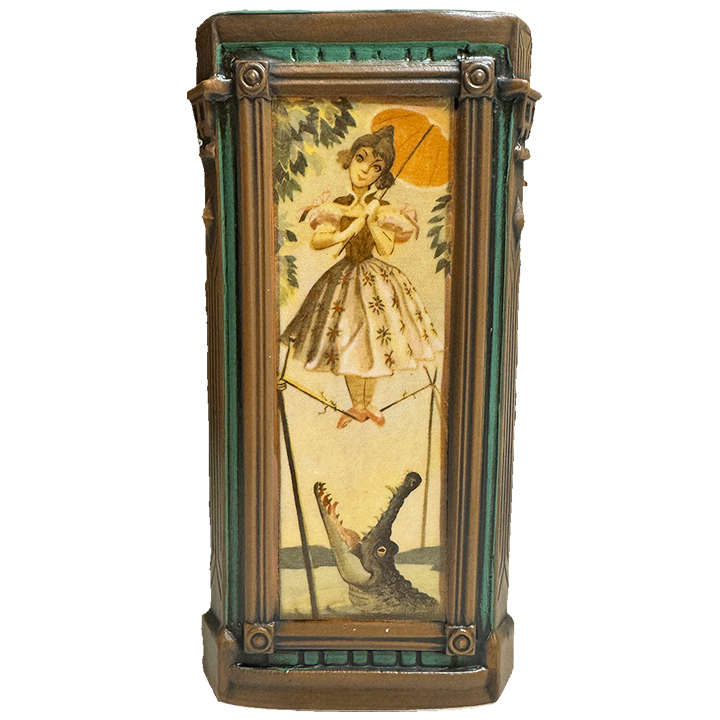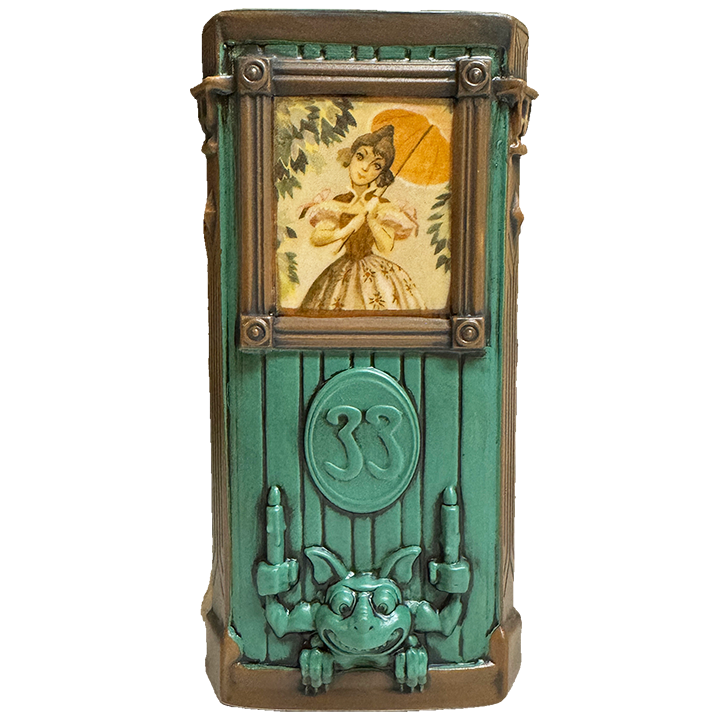This ceramic cocktail mug was designed by Tim Wollweber for Disney’s exclusive Club 33. It is one of four mugs in a collection celebrating the stretching portraits from Walt Disney’s famous attraction The Haunted Mansion. Each of the mugs features two versions of a painting from the theme parks. One version is partially obstructed by a frame with the Club 33 logo and a Souris-Chaude Gargoyle underneath. The other side reveals the painting in full. The paintings are captured using fired-on ceramic decals. This particular mug depicts the Tightrope Walker, who is a woman in a dress holding a parasol while balancing on a tight rope above alligator infested waters.