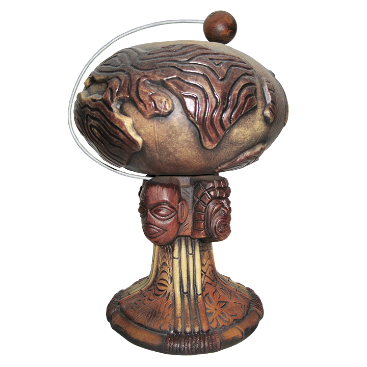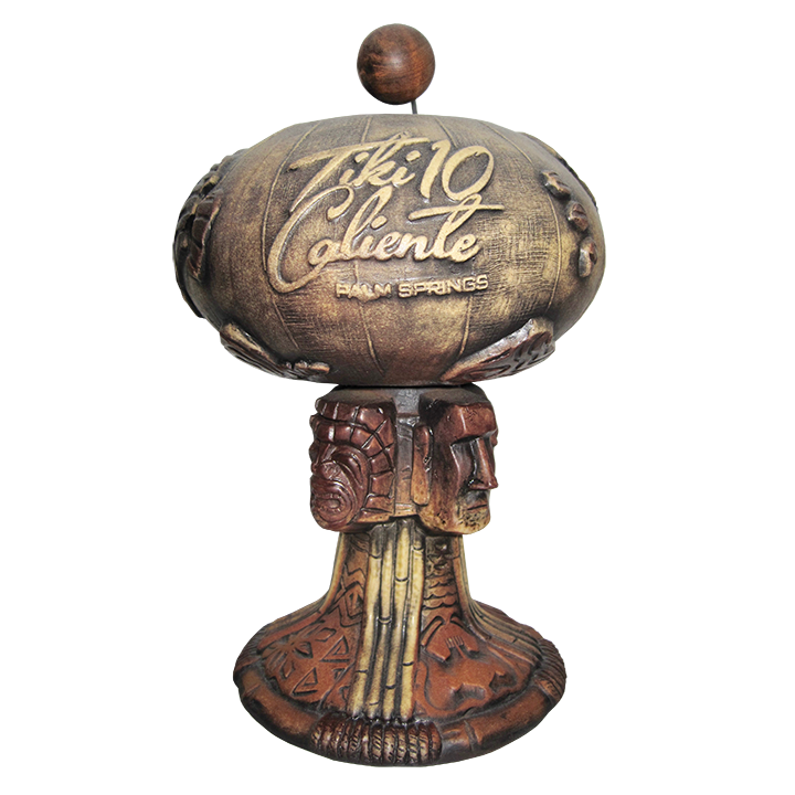 Specially designed for Tiki Caliente’s 10th Anniversary, this tiki mug depicts the iconic Witco Globe and is also known as the “In The Lap of the Gods” tiki chalice. The base of the mug features four tiki God masks that represent the islands of Hawaii, The Marquesas, Rapa Nui and Raratonga. It is also accented with four tapa patterns and features an orbiting wooden ball.