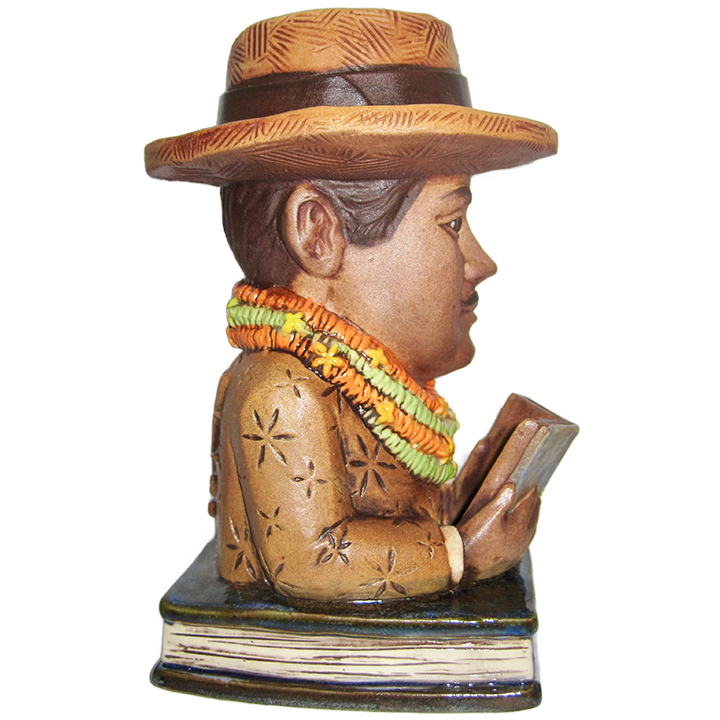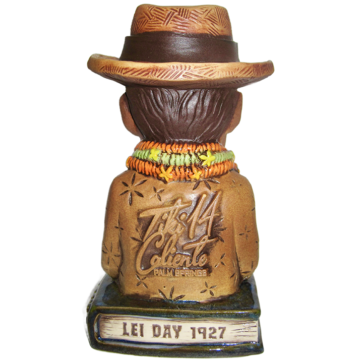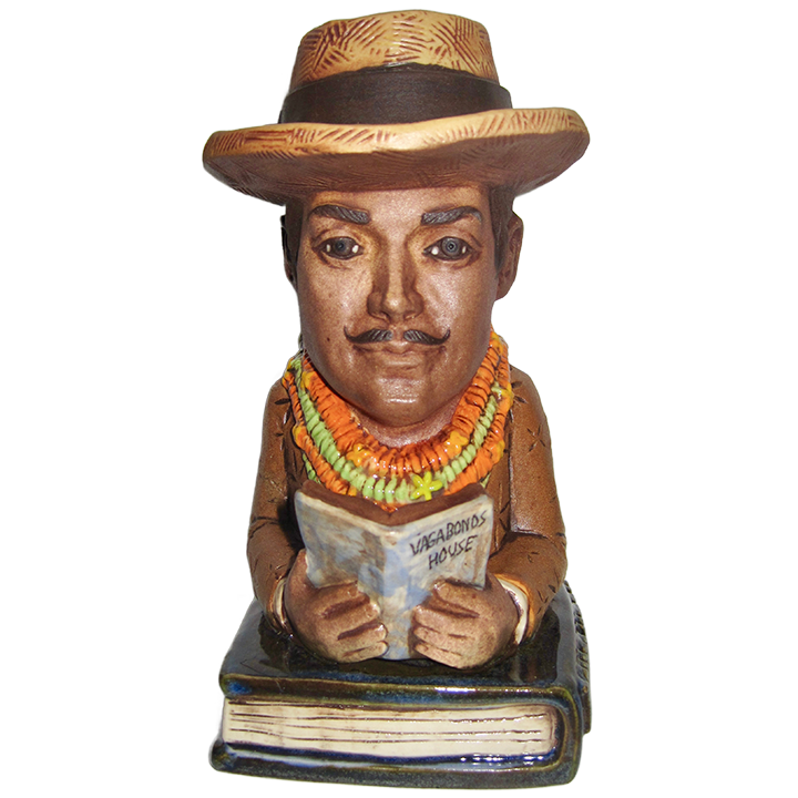 This ceramic cocktail mug was designed by Doug Horne and produced by Eekum Bookum for the Tiki Caliente 14 event in 2023. The mug pays homage to Don Blanding. This mug depicts the bust of Don reading a book while wearing a suit jacket, hat, and several leis around his neck.