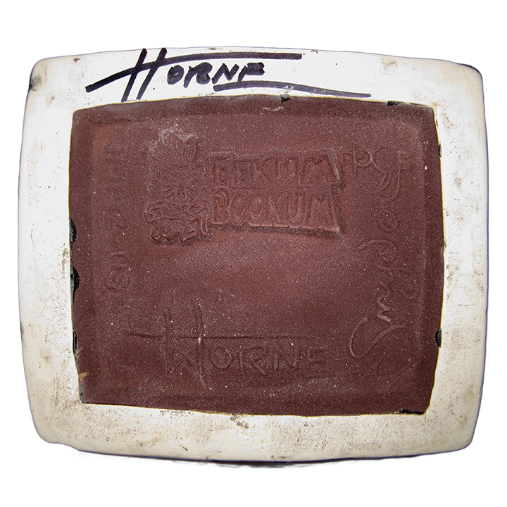 Unique Markings: “Vagabond’s House” is written on the front of the book being read and “Don Blanding” is written on the spine. The back of the mug reads “Tiki 14 Caliente Palm Springs Lei Day 1927” and “JM 142 USA Eekum Bookum Horne Snyder” is written on the bottom of the mug.