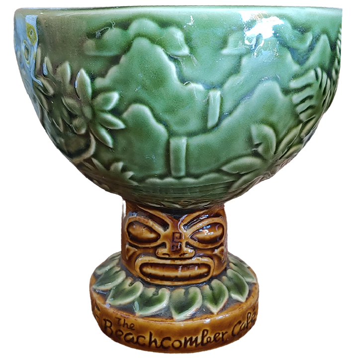 This ceramic cocktail chalice is adorned with jungle imagery on its outer bowl and the stem of the chalice is a traditional style tiki. “Beachcomber Cafe” is written around the base of the chalice.