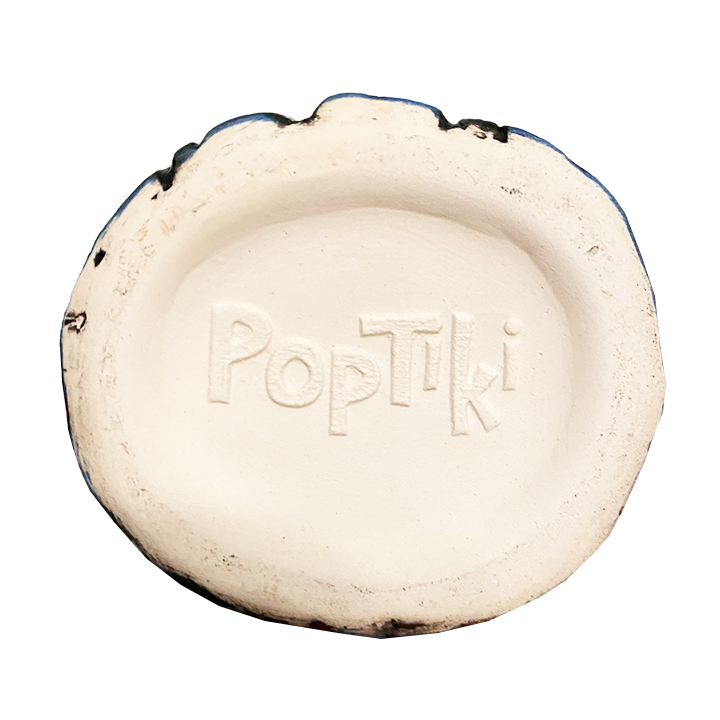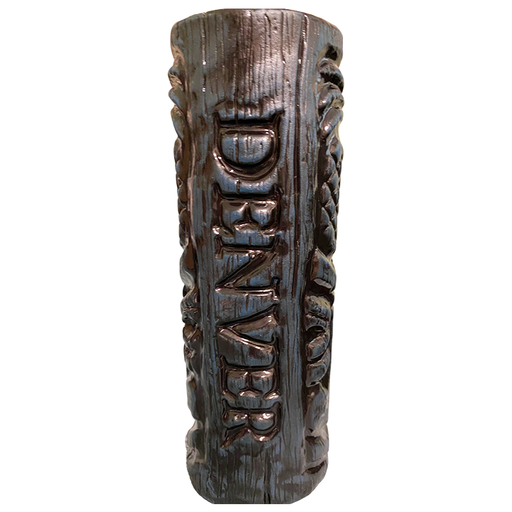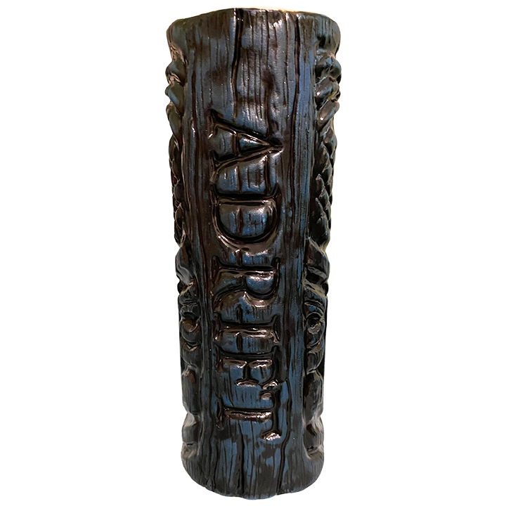 This ceramic Tiki mug looks like stylized blue and black driftwood with pineapples carved into it along with the Adrift bar logo.