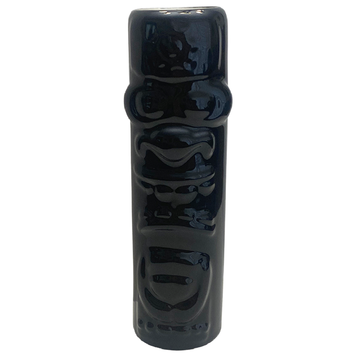 This ceramic mug depicts a standing tiki in a tumbler shape with large, square teeth and folded hands.