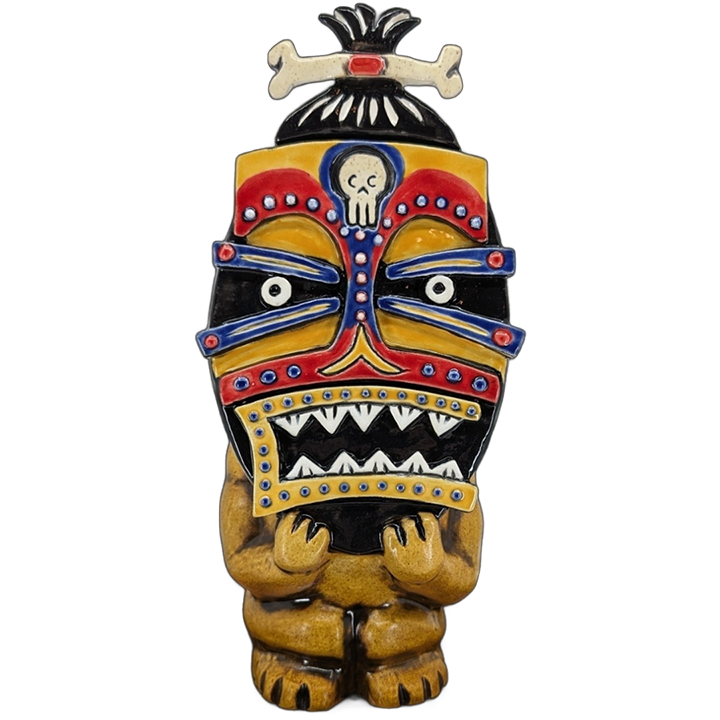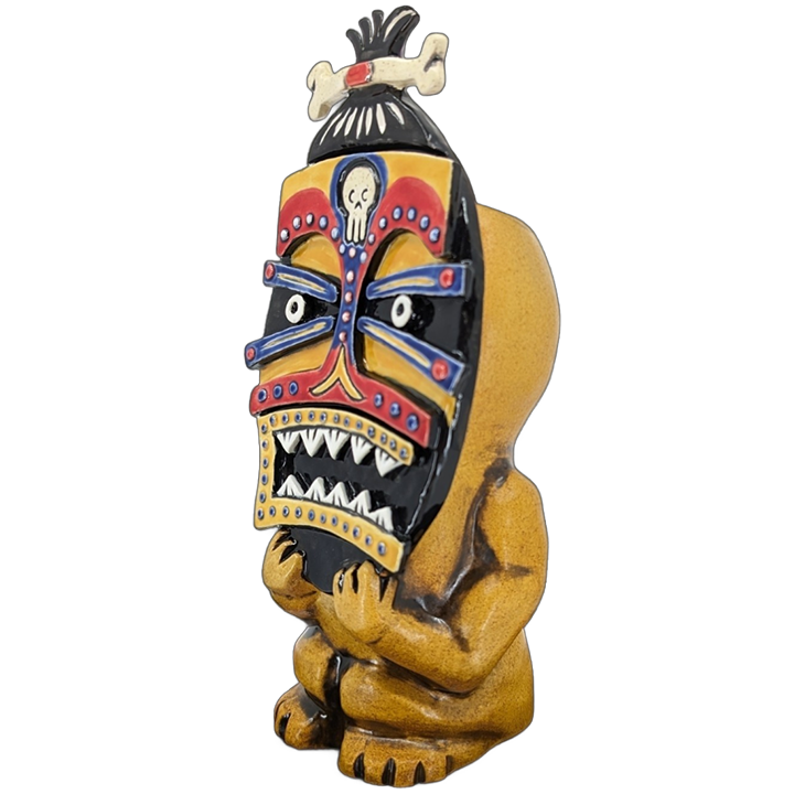 This tiki mug is part of TikiRob’s signature Mask Mug Collection. Rob’s collection features various masks that are significant to tiki culture. Some of the mugs are hand built one-of-a-kinds commissioned by collectors or sold in art shows. Other mask mugs are limited edition runs of usually no more than 50 mugs. Even Rob’s small mug runs have distinct carvings and glazes that make each mug unique. Rob’s mugs are made in South Maui. This particular mask mug is a one-of-a-kind commission piece for a private collection.