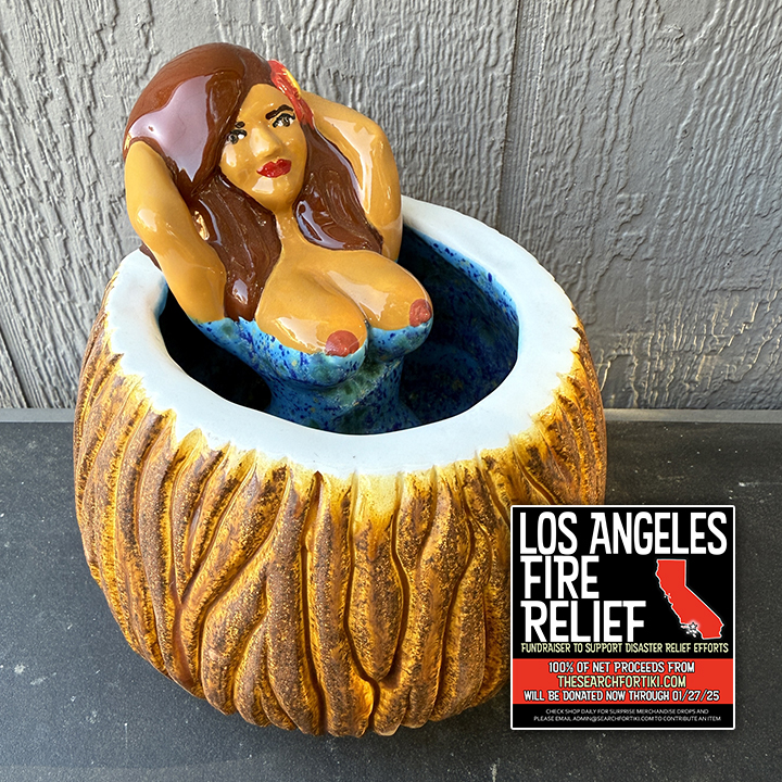 This ceramic cocktail mug was generously donated from a private collection to raise funds for charity. 100% of the net proceeds from this mug will be donated to support relief efforts in Los Angeles after the recent devastating wildfires. This mug depicts a well endowed woman relaxing in a coconut tub. It was designed and manufactured by now retired artist Wendy Cevola.