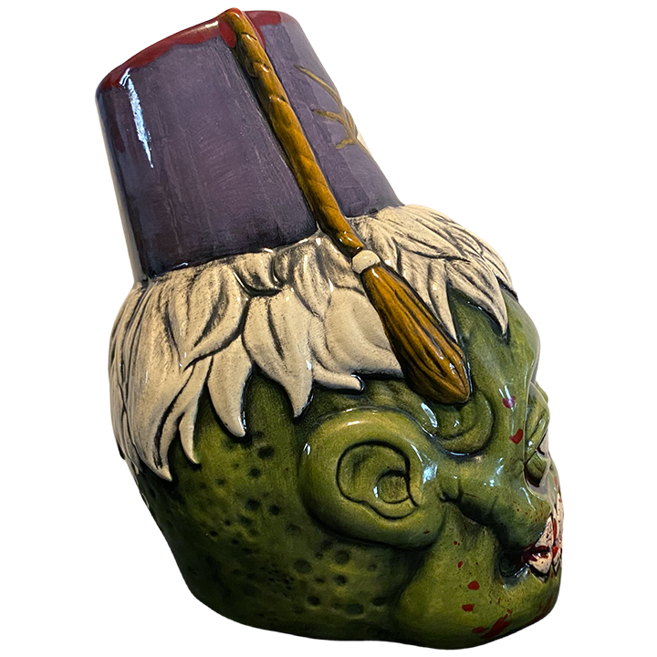 The ceramic cocktail mug depicts a stylized version of a zombie head wearing a fez with an all seeing eye. This particular version features blood splatters.