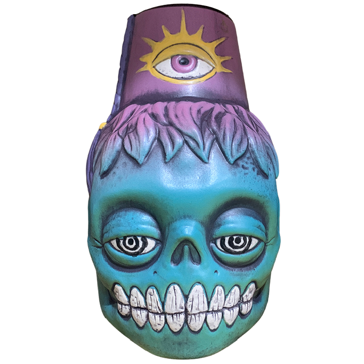 The ceramic cocktail mug depicts a stylized version of a zombie head wearing a fez with an all seeing eye. This particular version was released exclusively at DesignerCon 2021 and was limited to an edition of six mugs.