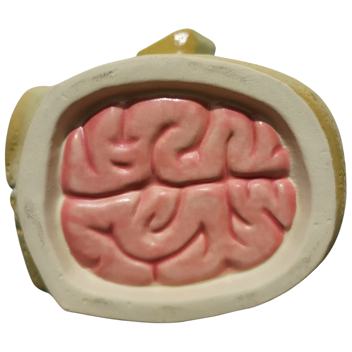 This ceramic cocktail mug depicts the upside-down severed head of a zombie with an exposed brain. This edition features a two tone green exterior, satin black interior, and satin pink brain, with hand-sculpted eyes and “radiation burns” making no two mugs alike.