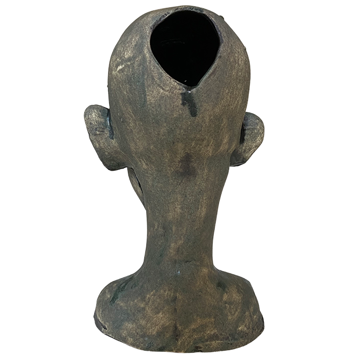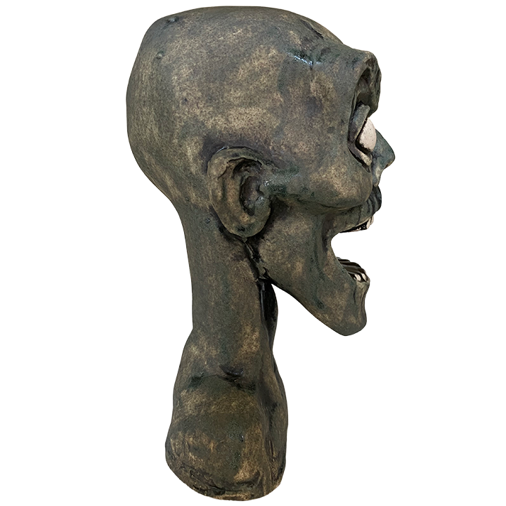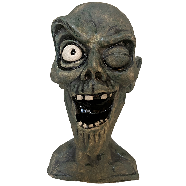 This ceramic tiki mug depicts the bust of a zombie with sunken-in cheekbones, one eye closed, a dramatic eyebrow, and a hanging jaw.